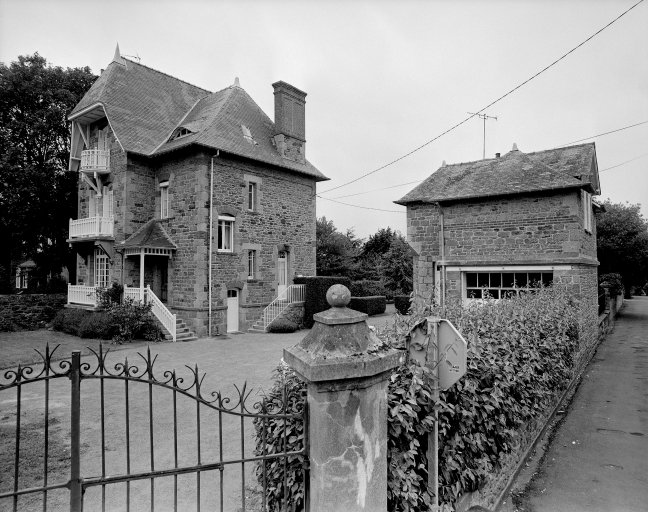 Vue de la maison et des communs prise de l'angle de la rue.Immatriculation