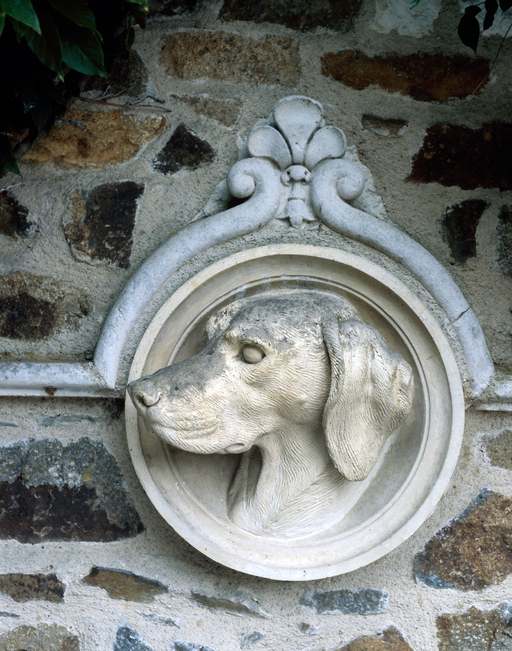 Communs : détail d'un médaillon, tête de chien de chasse.Immatriculation