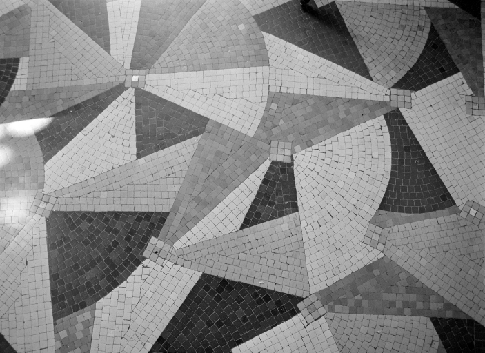 Détail du pavement de mosaïque de l'entrée.Immatriculation