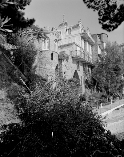 Vue générale sud-ouest éloignée de la façade postérieure de la villa Miramar prise de 3/4 avec contrefort.Immatriculation