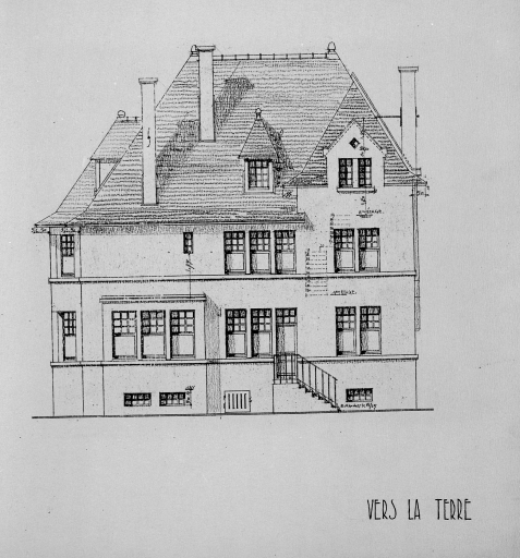 Projet de villa n°4, élévation de la façade vers la terre sur façade postérieure.Immatriculation