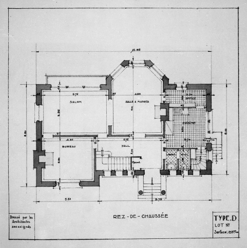 Projet de villa, variation du type D, plan du rez-de-chaussée.Immatriculation