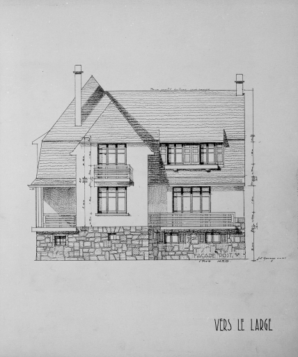 Projet de villa n°7, lot 23, élévation de la façade postérieure vers le large, coupe transversale.Immatriculation