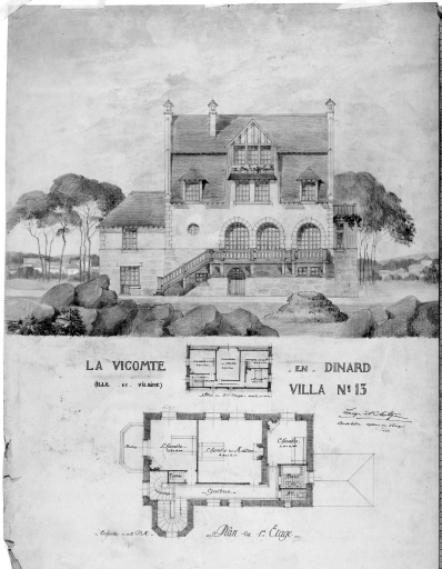 Projet de villa n°13, élévation principale, plan du 1er étage, plan du 2ème étage.Immatriculation