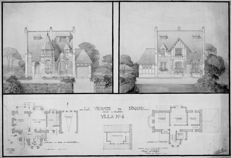 Projet de villa n°4, élévation principale sur jardin, élévation sur mer, plan du rez-de-chaussée, plan de l'étage, comble.Immatriculation