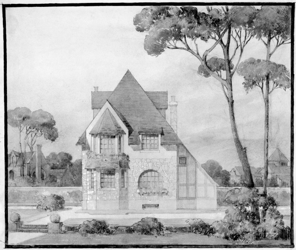 Projet de villa, élévation de façade d'entrée.Immatriculation