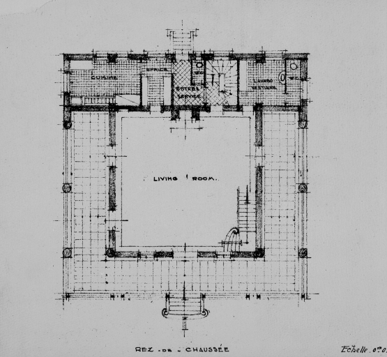 Projet de villa, variation du type C, hall central dit à l'anglaise type Caleta, plan du rez-de-chaussée.Immatriculation