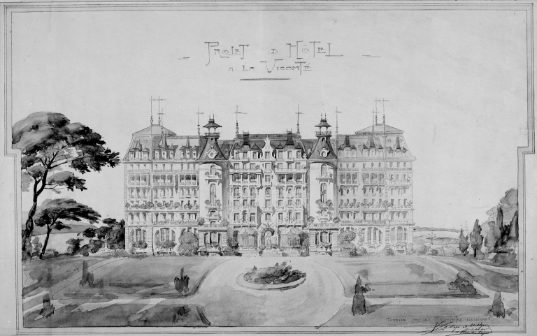Projet d'hôtel à la Vicomté, façade sur jardin, variante de projet néo-classique.Immatriculation