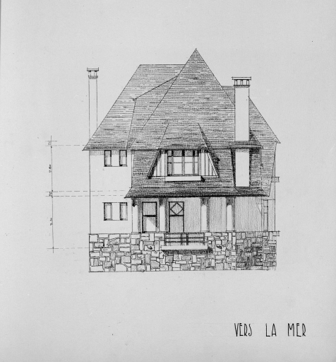 Projet de villa n°3, élévation de façade d'entrée vers la mer.Immatriculation
