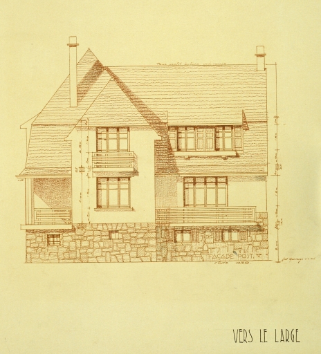 Projet de villa n°7, lot 23, élévation de la façade postérieure vers le large, coupe transversale.Immatriculation