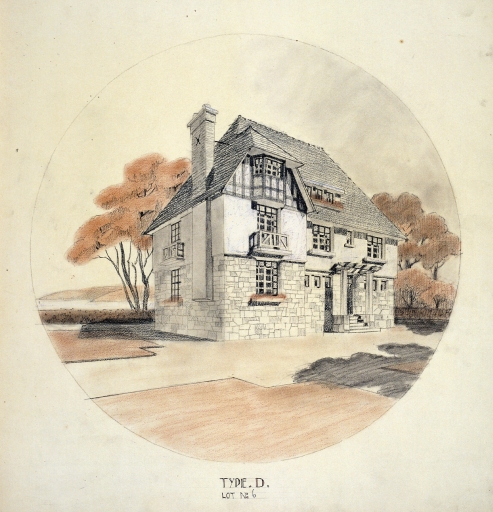 Projet de villa, variation du type D, lot n°6, élévation de façade.Immatriculation