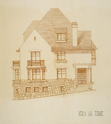 Projet de villa n°5, lot 11, élévation de façade vers la terre.Immatriculation