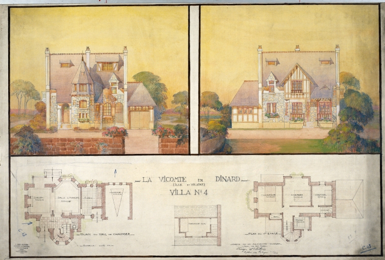 Projet de villa n°4, élévation principale sur jardin, plan du rez-de-chaussée, plan de l'étage, comble.Immatriculation