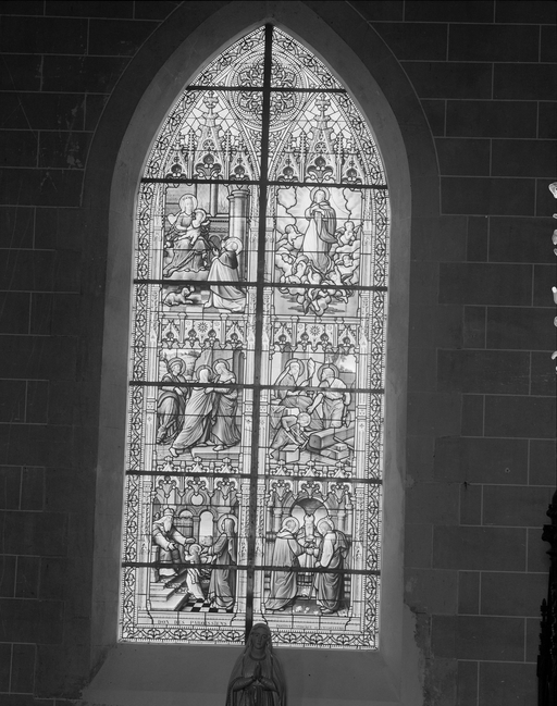 Verrière de la baie 3 (verrière hagiographique) : Présentation de la Vierge au temple, Mariage de la Vierge, Visitation, Sainte Famille, Assomption, Don du rosaire à saint Dominique,