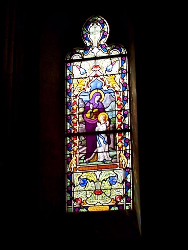 Verrière de la baie 14 (verrière à personnages, vitrail tableau) : Education de la Vierge,