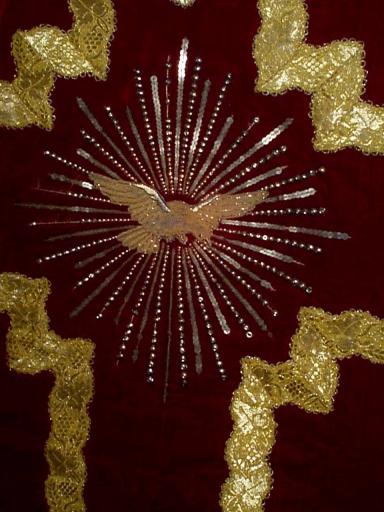 Ornement rouge 2 : chasuble, bourse de corporal, manipule, voile de calice,