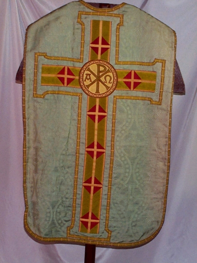 Ornement vert 1 : chasuble, bourse de corporal, étole, voile de calice,