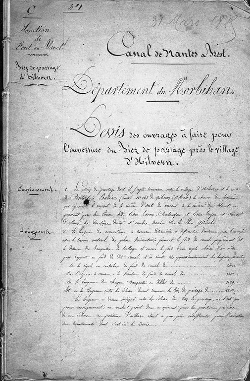 Canal de Nantes à Brest. Département du Morbihan. Devis des ouvrages à faire pour l'ouverture du bief de partage près le village d'Hilvern. Devis [s. n. ; s. d.] [31 mars 1825 ? ]. Papier, encre, 31,5x45.