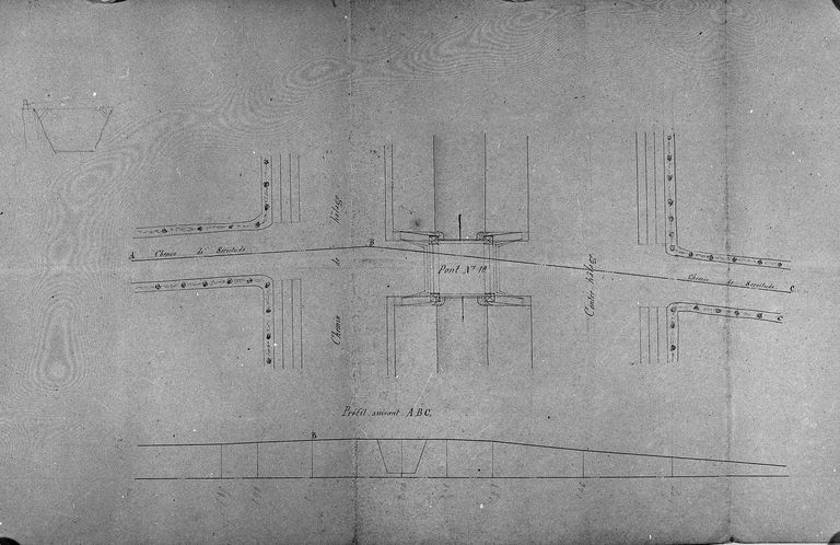 [Pont type n° 10 sur la rigole : plan et tracé des chemins de halage, contre-halage et de servitude ; profil]. Dessin, [s. n. ; s. d.]. Papier, encre, aquarelle.
