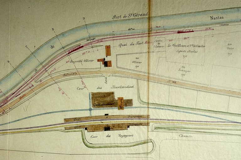 Chemins de fer de l'Ouest. Direction des Travaux. Service de l'Entretien et de la Surveillance. Ligne de St-Brieuc à Pontivy. Gare de St-Gérand. Etablissement d'un raccordement de la gare avec le quai du port. Plan général. Plan, [s. n.], 8 avril 1891. Calque, encre, aquarelle, 101,5x30,6.