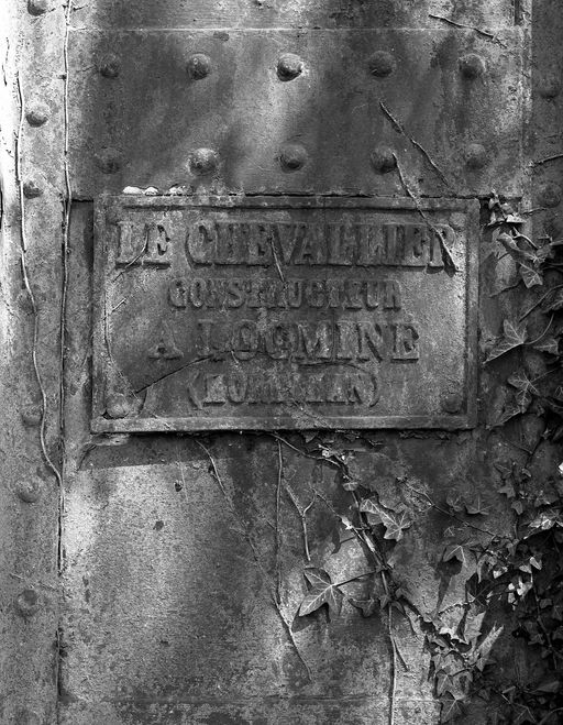 Pont : plaque métallique indiquant le nom du constructeur (état en 1997)Immatriculation