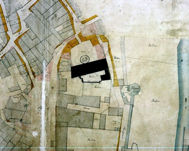 Plan d'alignement et de voirie, 1840, section B, partie centrale : Mairie, enceinte à l'est, place des Lices à l'Ouest. AM Vannes.Immatriculation