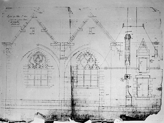 Église paroissiale du Roc Saint-André. Élévation des gâbles de la façade sud et de la sacristie. Crayon gris sur papier, attribué à Arthur Regnault, architecte, 1900.