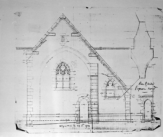 Église paroissiale du Roc Saint-André. Élévation du pignon nord. Crayon gris sur calque, attribué à Arthur Regnault, architecte, 1900.