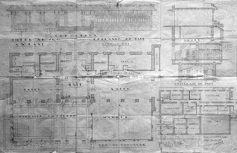 Plan et élévation de la terrasse et du hall, par Joseph Brilhault, 1928 (A. P.)Immatriculation