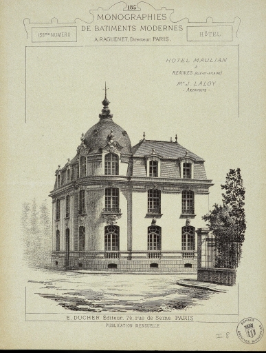 Vue générale de l'hôtel de Maulion, publiée dans Monographies de bâtiments modernes, 12e année, A. Raguenet, 1900-1901 (A. C. Rennes).Immatriculation