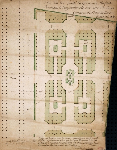 Plan d'un bois planté en quinconce, d'enfilade pararelles (sic) et diagonalement aux arbres du Cours ..., dessin par Forestier de Villeneuve, 1741 (A. C. Rennes).Immatriculation