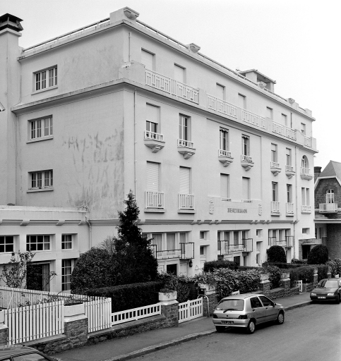 Vue générale de la façade sur une rue descendante de l'hôtel Beauvallon.Immatriculation