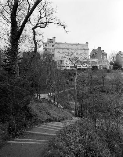 Vue générale de la façade arrière de l'hôtel Beauvallon, avec jardin en terrasse.Immatriculation