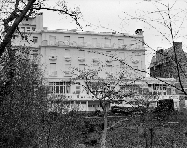 Vue générale rapprochée de la façade arrière de l'hôtel Beauvallon avec partie jardin.Immatriculation