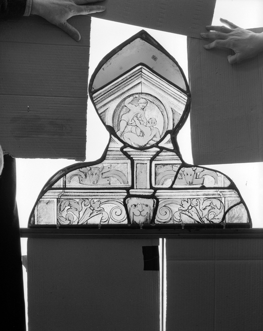 Vitrail en cours de restauration : Gladiateurs combattants (tête de lancette, détail dais architectural).Immatriculation
