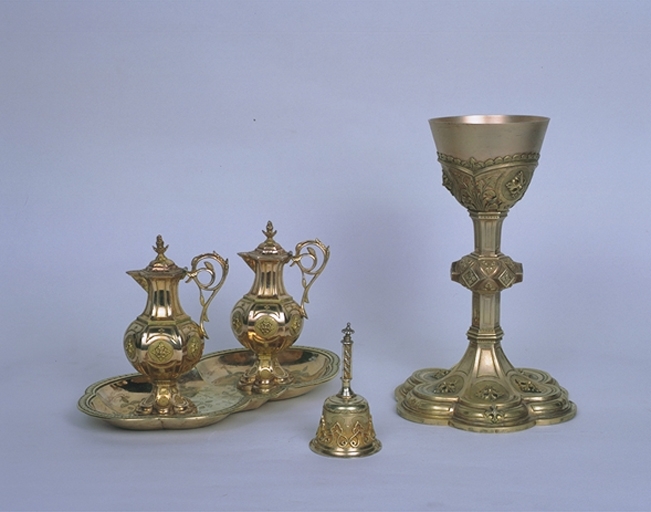 Chapelle : calice, 2 burettes, plateau à burettes, sonnette d'autel,