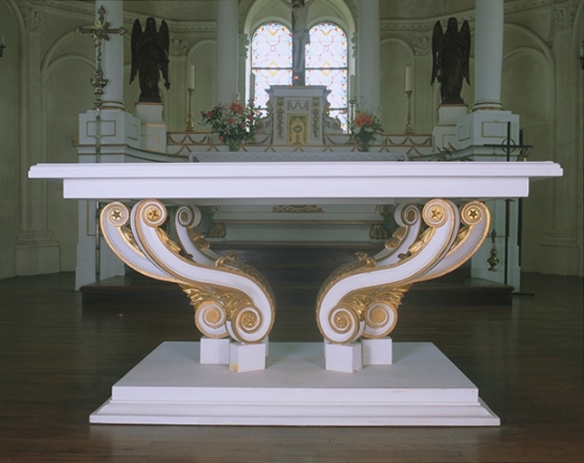 Ensemble de mobilier : 3 stalles, crédence, chaire à prêcher, autel,