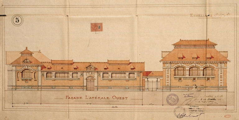 Halle centrale, façade latérale ouest, dessin aquarellé, par Emmanuel Le Ray (A. C. Rennes)Immatriculation