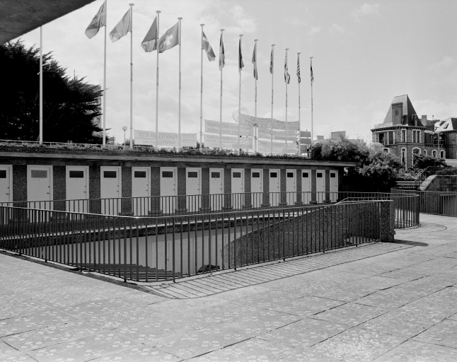 Plage de l'Ecluse, ensemble de cabines de bain, vue de la partie centrale sur terrasse, vers 1950Immatriculation