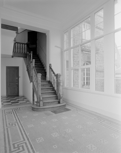 Vue de l'escalier intérieur avec vestibule.Immatriculation