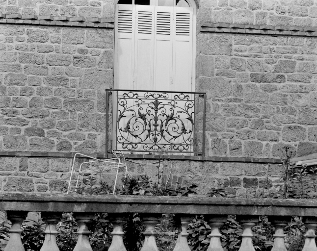 Détail du balcon du 1er étage sur façade arrière.Immatriculation