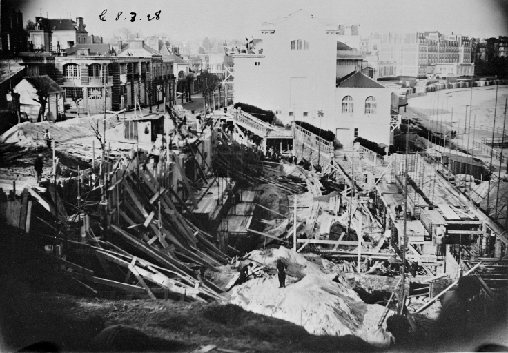 Photographie prise lors du chantier du casino-balnéum, vue plongeante sur le chantier, le 8 mars 1928.Immatriculation