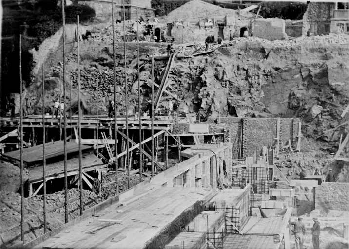 Photographie prise lors du chantier du casino-balnéum, structure en béton armé et en maçonnerie des moellons, 10 mars 1928.Immatriculation