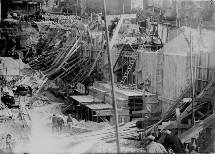 Photographie prise lors du chantier du casino-balnéum, travaux en béton armé, 10 mars 1928.Immatriculation
