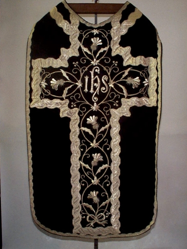 Ornement noir : chasuble, bourse de corporal, étole, manipule, voile de calice,