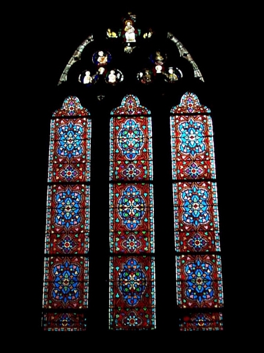 Verrière de la baie 8 (verrière décorative) : Le Christ et le tétramorphe, anges musiciens et portant des phylactères,