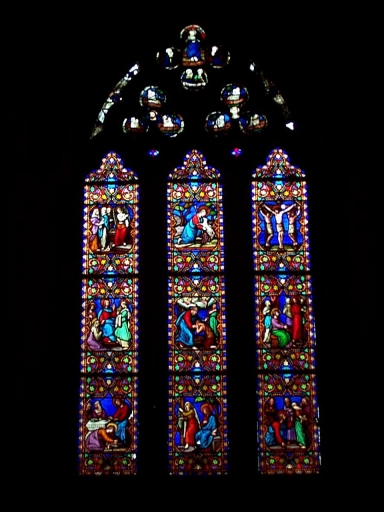 Verrière de la baie 14 (verrière décorative) : Jugement dernier, Le Pardon, La Rédemption,