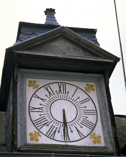 Logement de contremaître, détail de l'horloge.Immatriculation