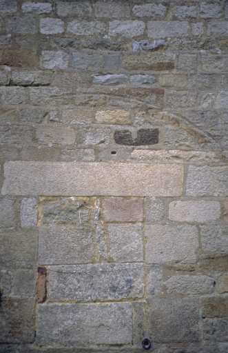 Pignon nord, détail côté coursier. On aperçoit les traces de la roue hydraulique et l'orifice, obstrué, par lequel passait son arbre.Immatriculation