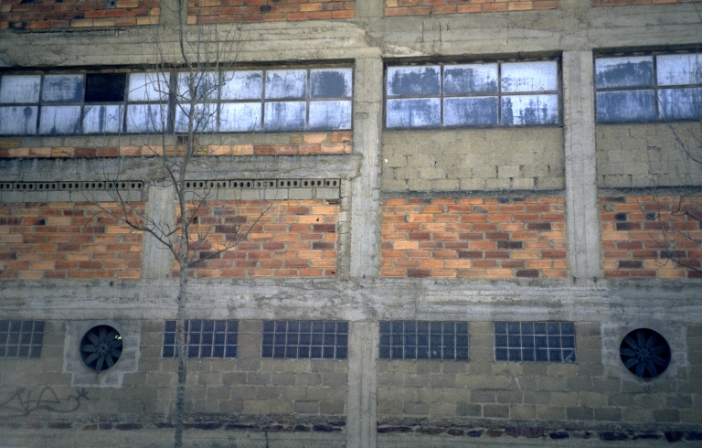 Détail de la façade nord donnant sur la rue des Français libres (appareil mixte en briques creuses, parpaings de béton et béton armé).Immatriculation